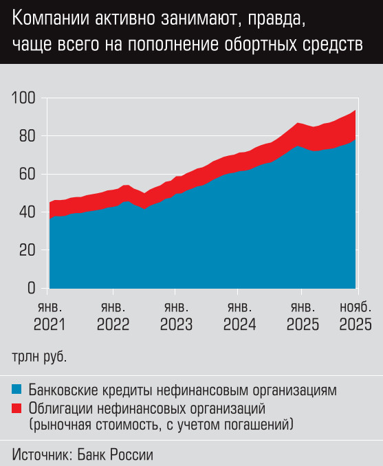 Нельзя сказать, что в экономике нет денег. Например, по оперативным данным Росстата, объем инвестиций за январь– сентябрь 2025 года составил 20,8 трлн рублей. В то же время на 1 ноября средства на счетах и депозитах (без учета начисленных процентов) компаний, по данным ЦБ, составили 59,8 трлн рублей, на счетах и депозитах физических лиц — еще 62,2 трлн рублей.