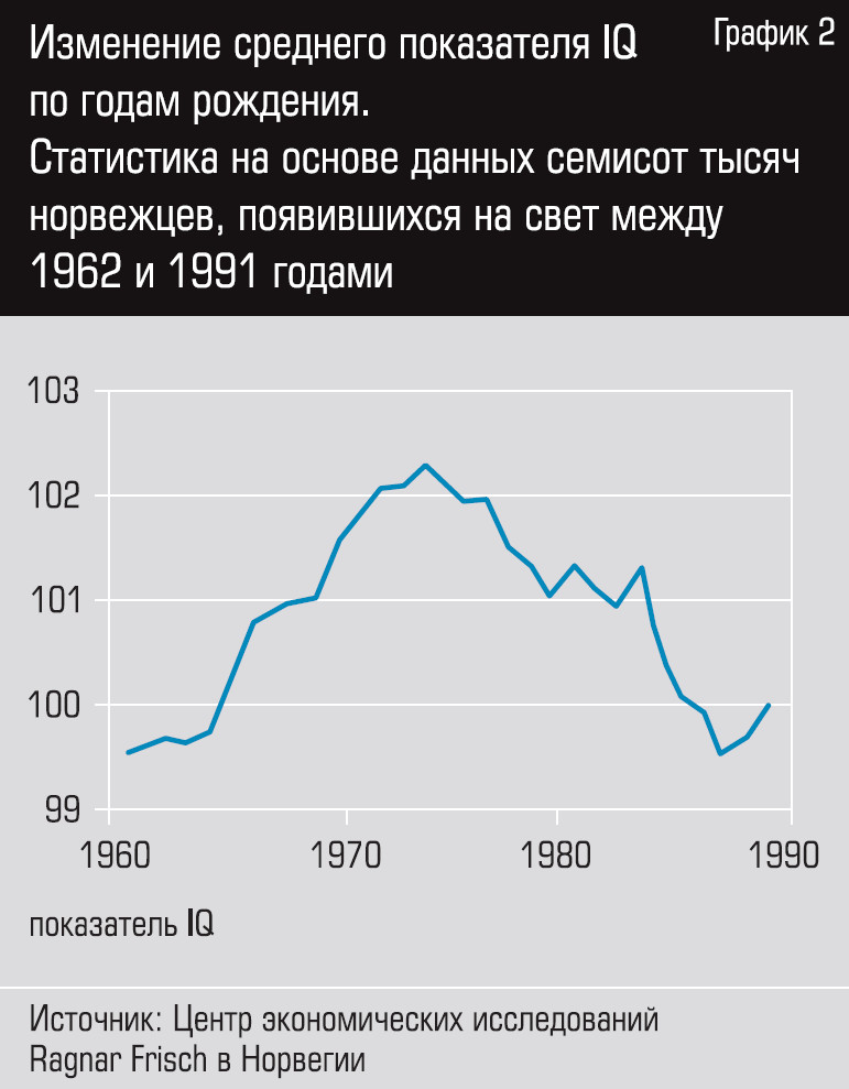 Известен так называемый эффект Флинна (назван в честь новозеландского психолога Джеймса Флинна, опубликовавшего в 1984 году статью «Средний IQ американцев: массовый рост с 1932 по 1978 год»), согласно которому каждое новое поколение становится умнее предыдущего как в отдельных странах, так и в целом по миру. Этот эффект рассматривался учеными как парадокс: его оказалось невозможно объяснить факторами эволюционно-генетического толка. Однако дальнейшие исследования этого феномена в отдельных популяционных группах показали, что с середины 1990-х рост остановился, а затем начался спад. Люди как будто разделились на два условных лагеря: одни с критическим мышлением, а другие — с клиповым.
