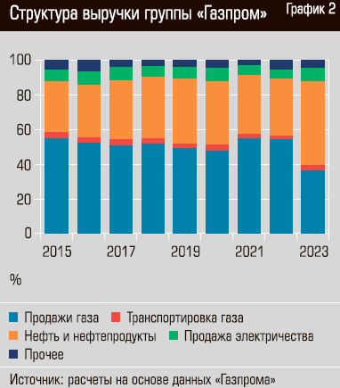 В структуре выручки, согласно данным корпоративной отчетности «Газпрома», доля доходов от продаж газа, в последнее десятилетие традиционно превышавшая половину, в прошлом году опустилась до 36% (см. график 2). В то же время доля нефтяного и нефтехимического сегмента выросла с 35% в среднем в 2018–2021 годах до 48% по итогам 2023-го. То есть группу «Газпром» по структуре ее выручки в 2023 году было бы уже целесообразно именовать нефтяной корпорацией.