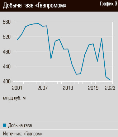 Производственные показатели по газу в 2023 году тоже пробивали дно. Объем добычи, например, по итогам года составил всего 404 млрд кубометров. Это исторический антирекорд, Никогда в постсоветский период «Газпром» не добывал так мало. В 2022 году, например, было добыто 412,9 млрд кубометров, в «довоенном» 2021-м — 515,6 млрд кубометров. В более хорошие времена показатель добычи газа «Газпромом» переваливал за 550 млрд кубометров в год (см. график 3).