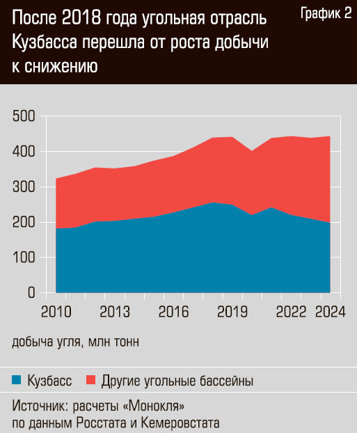 В ведущем угледобывающем регионе страны — Кузбассе — сокращение добычи продолжается уже седьмой год подряд. По сравнению с пиковыми показателями 2018 года кемеровская угледобыча недосчиталась уже 57,4 млн тонн — накопленный спад превысил 22%. Все последние годы весь, пусть и небольшой, рост общероссийской добычи обеспечили новые угольные месторождения в Восточной Сибири и на Дальнем Востоке — в Хакасии, Якутии, Амурской области и Хабаровском крае.
