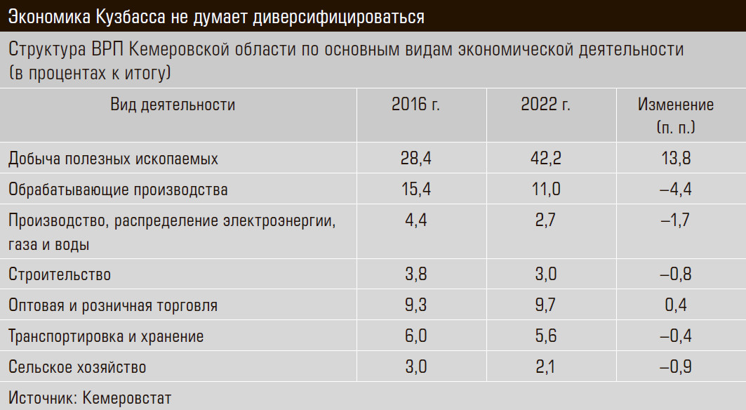 Несмотря на прохождение пика добычи, в структуре экономики Кемеровской области «флюс» угледобычи не сдувается. В 2022 году вид деятельности «Добыча полезных ископаемых» в ВРП региона достиг невероятных 42,2% против 28,4% в 2016 году. За это время совокупный вес обрабатывающих отраслей сократился с 15,4 до 11%, сжались и сельское хозяйство, и стройка, и транспорт, немного подросла только доля торговли (см. таблицу).