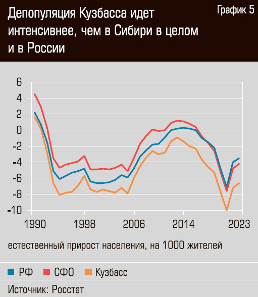 Очень тревожны демографические тенденции. Естественная убыль населения Кемеровской области в расчете на тысячу жителей с начала 1990-х годов систематически превышает значения этого показателя для СФО и страны в целом (см. график 5), а начиная с 2010 года жители Кузбасса голосуют против своего региона ногами (фиксируется систематический миграционный отток), как, впрочем, и кошельками — заметную часть заработков кемеровчане предпочитают тратить за пределами области, прежде всего в преуспевающей столице Сибири — соседнем миллионнике Новосибирске. Со времени последней советской переписи 1989 года население Кузбасса сократилось на 20%, или на 650 тыс. человек (для сравнения: крупнейшие города области, Кемерово и Новокузнецк, насчитывают сегодня порядка 550 тыс. жителей каждый). Возрастная структура населения неблагоприятна. Если в середине 2000-х демографическая нагрузка в регионе примерно соответствовала среднероссийскому уровню, то в 2020 году она составила 808 иждивенцев на тысячу трудоспособных против 713 в целом по стране (см. график 6).