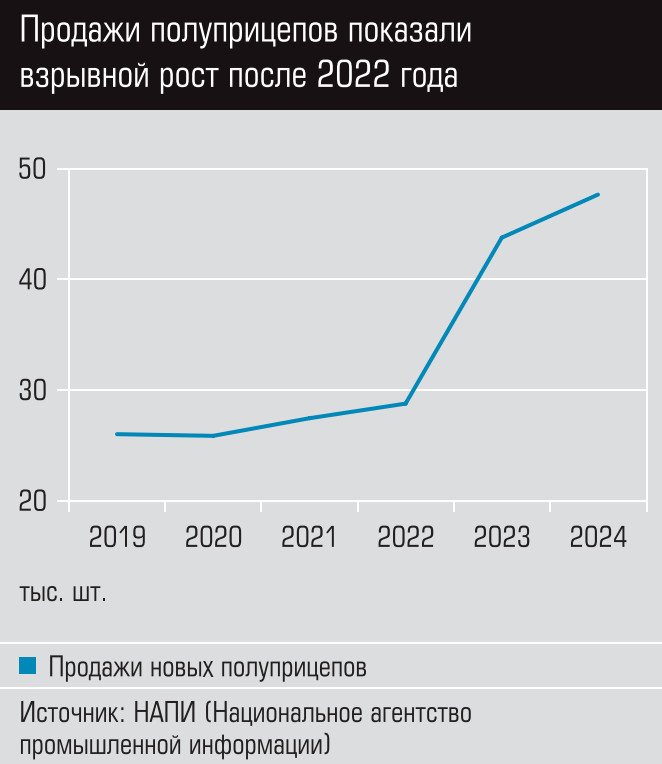 2022 года, согласно Business Stat, грузоперевозки автомобильным транспортом в нашей стране выросли на 22%. Это стало следствием подъема промышленного производства и потребительского спроса, а также объективных логистических изменений. Ограниченная пропускная способность железных дорог, переориентация транспортных потоков с запада на восток и возросшее транспортное плечо также способствовали наращиванию трафика. «Компании также меняют схемы погрузки-разгрузки, чтобы сократить простои. Пока разгружается один полуприцеп, к освободившемуся тягачу цепляется следующий, что приводит к росту спроса на прицепную технику», — пояснила директор маркетингового агентства НАПИ Татьяна Арабаджи. Отдельные сегменты рынка грузовой спецтехники отреагировали на это уверенным ростом показателей. По данным НАПИ, в 2022 году в России было продано 28 820 новых полуприцепов, а в 2024 м уже 47 700, что соответствует росту продаж более чем на 65% за три года.