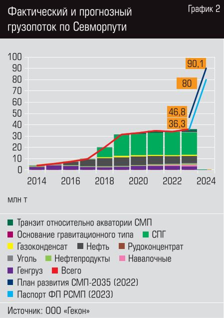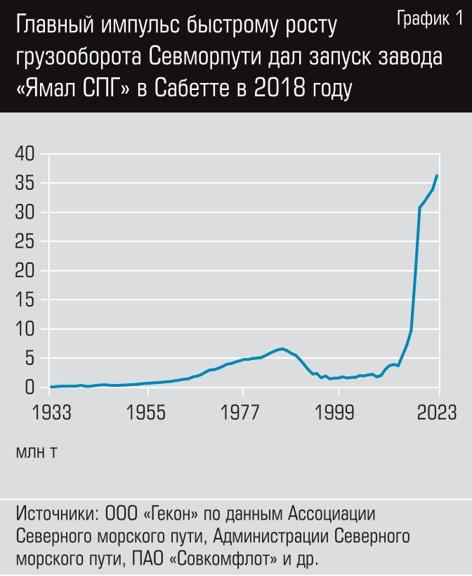 По итогам 2023 года оборот Северного морского пути поставил новый рекорд: по трассе перевезено 36,2 млн тонн грузов. Это в пять с половиной раз больше советского максимума (6,6 млн тонн в 1987 году). Рывок произошел пять лет назад, когда к горнорудной продукции Норильского промышленного района, на протяжении нескольких десятилетий составлявшей основу грузовой базы СМП, добавились сначала нефть Нового порта, а затем сжиженный природный газ с проекта «НоваТЭКа» «Ямал СПГ». В работе еще несколько крупных арктических ресурсных проектов, которые должны, по крайней мере в заявленных планах и стратегических документах, уже в ближайшей перспективе кратно увеличить объем перемещаемых по СМП грузов.