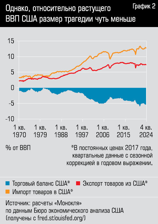 Впрочем, излишне драматизировать ситуацию не стоит. Нужно учитывать и рост экономики США. Если мы посмотрим на график экспорта, импорта и торгового баланса США в сравнении с ВВП, то в долгосрочной перспективе проблема будет скорее хронической, с отрицательной динамикой, но не трагедией вселенского масштаба (см. график 2). Да, в четвертом квартале 2024 года дефицит торгового баланса США (в годовом выражении) составил минус 5,35% ВВП, но уровень торгового дефицита в 5,1% ВВП можно было увидеть и в 2004 году, а в начале 2022-го он и вовсе достигал минус 5,98% ВВП. Так что болезнь застарелая, но не в острой фазе. Из крупных стран сравнимый дефицит торгового баланс имелся (в 2023 году) у Румынии (минус 4,78% ВВП) и Греции (минус 4,93%), а еще больший у Пакистана (минус 7,33%) и Грузии (минус 7,54% ВВП). В качестве совсем уж клинического случая можно привести Молдову с ее торговым дефицитом в минус 24% ВВП.