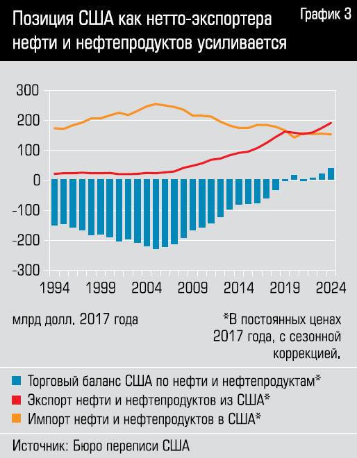 США упорно работают над ее «лечением»: важным шагом стало то, что к 2020 году они решили одну из своих давних проблем и из нетто-импортера превратилась в нетто-экспортера нефти и нефтепродуктов (см. график 3). В 2024 году США импортировали нефти и нефтепродуктов на 235,8 млрд долларов, а экспортировали на 280,7 млрд долларов, выйдя в плюс на 44,9 млрд долларов (33 млрд годом ранее). Для этого понадобились годы упорного труда: сланцевая революция, демпинг на рынке и исключение России и Ирана из мирового нефтяного рынка (исключение не удалось, но свою долю на нефтяном рынке США выгрызли).