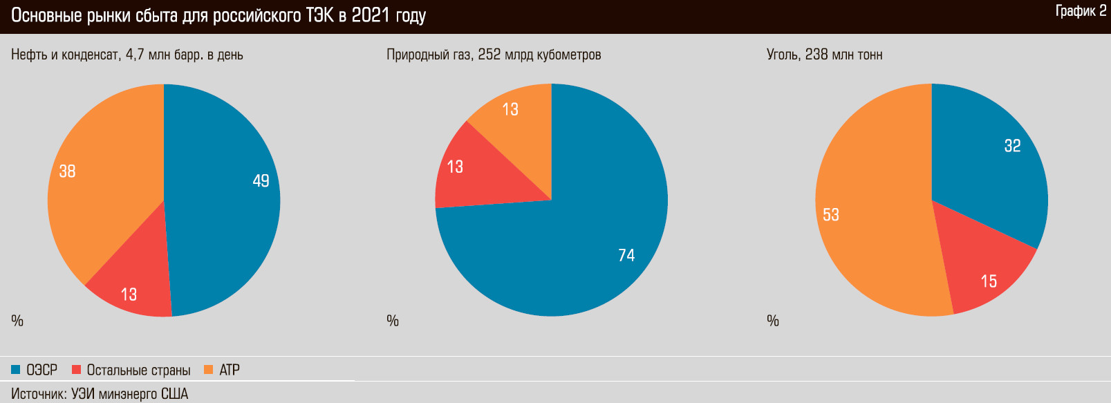 Треть экспорта угля, половина нефти и три четверти газа (см. график 2) уходило из России в Европу в 2021 году. Россия как «страна-бензоколонка» работала исправно, снабжая ЕС дешевыми источниками ископаемого сырья, а также платила штрафы, выписанные Стокгольмским арбитражем, давала возможность нажиться на перепродаже природного газа немецким трейдерам, модернизировала НПЗ в Европе (в Германии, Италии, Болгарии), строила там магистральные газопроводы, систему сбыта топлива и т. п.