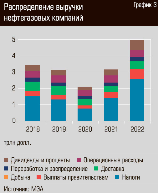 Кроме того, нефтегаз — основа российского бюджета. Так не только в России: согласно статистике МЭА, мировой нефтегаз направляет на выплату налогов половину своей выручки (см. график 3). Поэтому легко понять логику G7: эти страны, с одной стороны, не хотели ли шиться поставок российского топлива на мировой рынок, но желали заметно сократить доходную базу бюджета Российской Федерации. Казалось, что этого легко будет добиться через ценовое давление на российскую нефть.