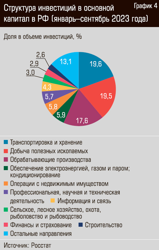 При этом, если судить по данным Росстата (без МСП и инвестиций, не наблюдаемых напрямую), то 46,3% всего объема инвестиций в основной капитал было направлено на строительство нежилых зданий и сооружений, 34,2% — на закупку машин, оборудования и транспортных средств, 6,4% — на объекты интеллектуальной собственности, 6% — на строительство жилых зданий и помещений.