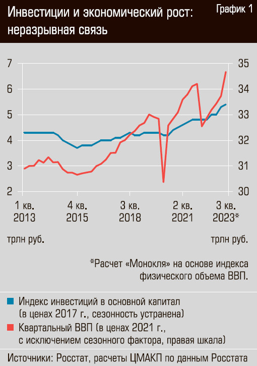 Как видно из этих данных, инвестиции в основной капитал напрямую создают спрос на инвестиционные товары, который сразу отражается в ВВП — в том году, в котором они были осуществлены. В официальной статистике это отражается в данных ВВП по использованию доходов, в графе «валовое накопление основного капитала». Там инвестиции идут в формате «приобретение за вычетом выбытия ценностей». Доля этого показателя в годовом ВВП в 2011–2022 годах стабильно составляет 20–21%. В первом и втором кварталах 2023 года было 15,3 и 20,8% соответственно, что примерно на 1–2 п. п. выше, чем в тех же кварталах предыдущих лет.