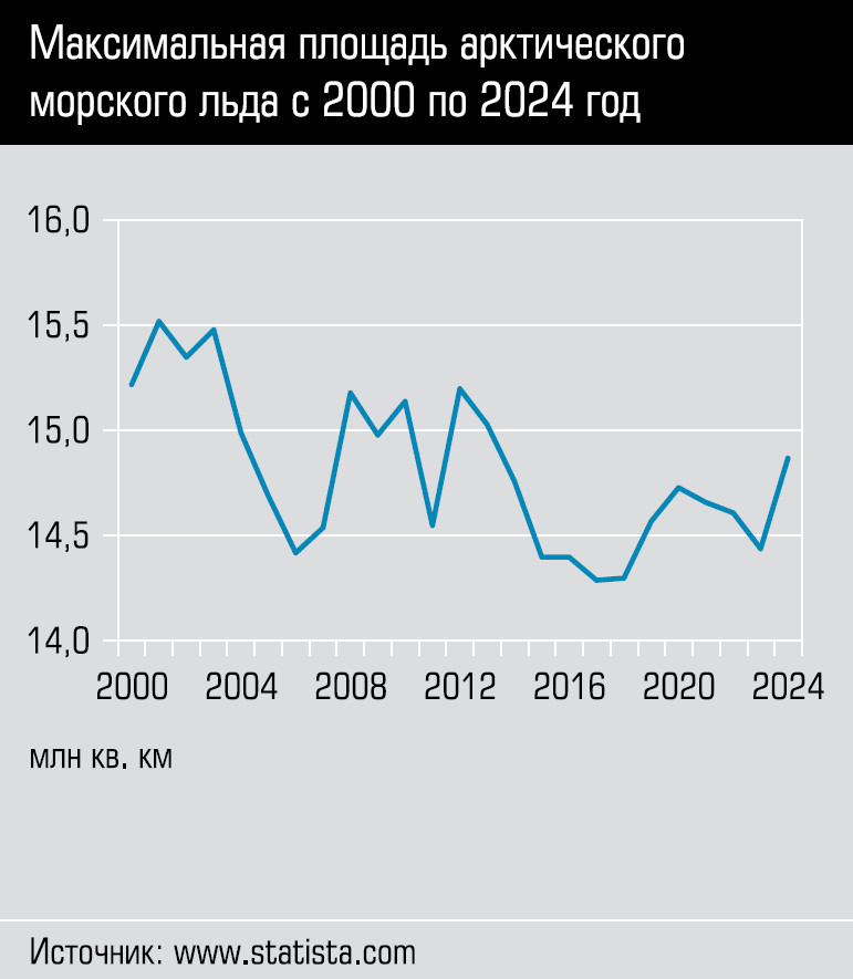 «Начиная с 2020-х годов климатические модели указывают на формирование условий для безледной навигации за пределами российской исключительной экономической зоны, — отмечает один из авторов работы, директор Института физики атмосферы им. А. М. Обухова РАН академик Владимир Семенов. — Продолжительность этого периода растет практически линейно и может превысить 2,5 месяца уже к середине века (сейчас продолжительность этого периода в календарном году колеблется в пределах от 0 до 35 суток. — “Монокль”). После 2050 года темпы увеличения периода открытой воды начинают различаться: при умеренном сценарии рост замедляется, а при агрессивном — продолжается и может достичь 3,5 месяца к 2075 году и до 5,5 к концу века».