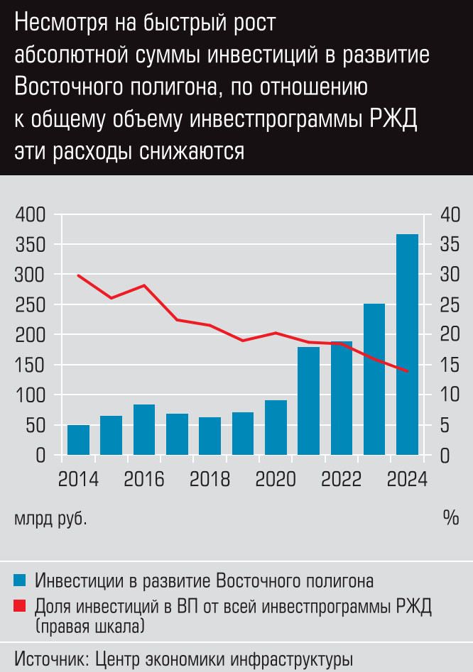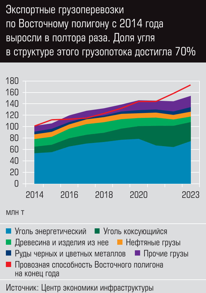 Программа модернизации ВП стартовала в 2013 году. За последующие десять лет в ходе двух этапов его модернизации было вложено 1,1 трлн рублей, что составило около 20% инвестпрограммы РЖД за этот период. Результат усилий налицо: провозная способность ВП увеличилась с 98 до 173 млн тонн, при этом львиную долю прироста грузоперевозок (82%) оттянул на себя уголь. Неуклонно росли как доля угля в перевозках ВП (в прошлом году она превысила 70%), так и доля данного направления в угольном экспорте (достигла 55% в 2023 году). При этом недовывоз неугольных грузов по ВП вследствие преференций угольщикам, по различным оценкам, составляет от 10 до 20 млн тонн ежегодно.