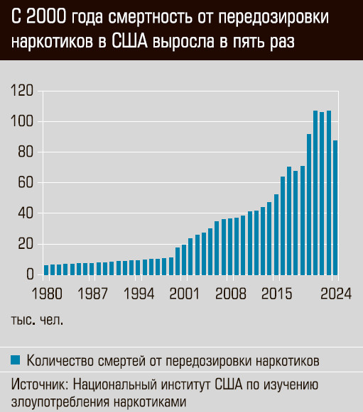 В США действительно существует проблема высокой смертности от передозировки наркотиков: в 2023 году умерло 107 тыс. человек, в 2024-м — 87 тыс. Всего же с 2000 года смертность от передозировки наркотиков увеличилась примерно в пять раз.