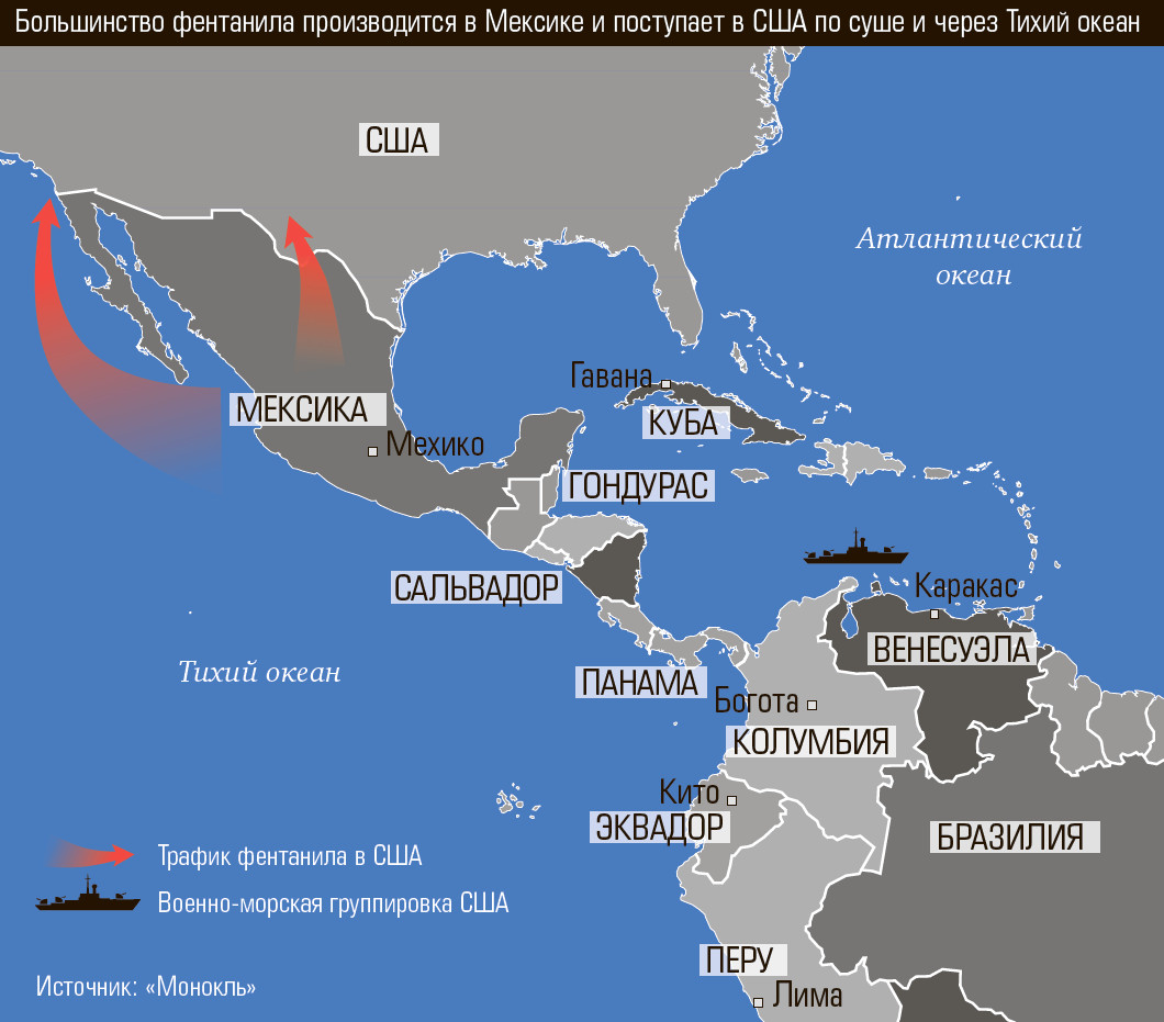 Итак, ключевые производители наркотиков, поступающих в США, Мексику и Колумбию, сами имеют выходы к Тихому и Атлантическому океанам, хотя частично трафик идет и через Венесуэлу. Однако фентанил производят преимущественно мексиканцы, и через американскую границу его поставляют в основном по суше. Тем не менее главным «не пойманным главой наркокартеля» был назначен Мадуро, и американский военный флот изо всех сил «перекрывает поставки наркотиков» у берегов Венесуэлы.