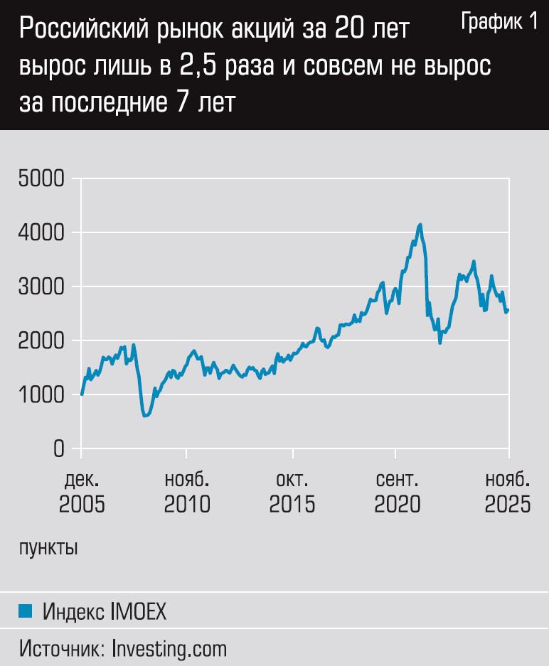 Термин «иксануть», или «сделать иксы», в инвесторской среде означает увеличить свои инвестиции в разы. Считается, что такую возможность должен давать рынок акций — однако наш рынок обескураживает. За последние двадцать лет индекс Московской биржи IMOEX вырос всего в два с половиной раза (см. график 1) — а, например, американский S&P 500 увеличился за это время в четыре раза. Более того, инвесторы, которые купили российские голубые фишки семь лет назад, в 2018 году, к настоящему времени не увеличили свои вложения вовсе, а с учетом инфляции еще и потеряли деньги.