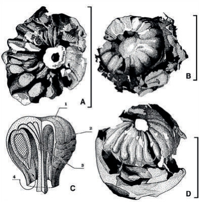 Если мы рассмотрим историю растительного мира, то увидим, что цветок – завоевание достаточно молодое, неважно, возник он 150 или 130 млн лет назад. Более древние формы имели самые разные способы размножения и распространения потомства: у папоротников и мхов есть спорангии, а у плаунов, хвощей, саговников и хвойных – стробилы. Среди всего многообразия половых органов растений особняком стоят корзиночки пельтаспермовых растений (Peltaspermales Delevoryas, 1979).
