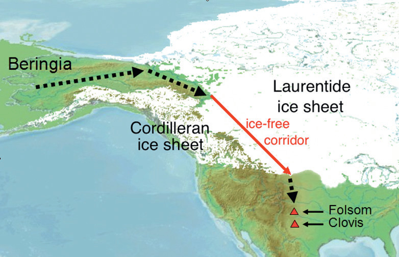 Отдельно стоит сказать несколько слов о том, где можно было в то время жить. Последнее большое оледенение закончилось около 12 тыс. лет назад. Именно вследствие случившегося тогда таяния ледника и затонула значительная часть Берингии, и не только она. Тогда же ушел под воду и Доггерленд, соединяющий с континентом Британию и многие другие земли. 13 тыс. лет назад, когда носители культуры кловис заселяли Америку, глобального потепления еще не случилось, и, с одной стороны, площадь суши, поднимающейся над уровнем Мирового океана была гораздо больше, но, с другой, значительная ее часть была занята ледником. Последний мог служить даже большим препятствием для передвижения, чем море.