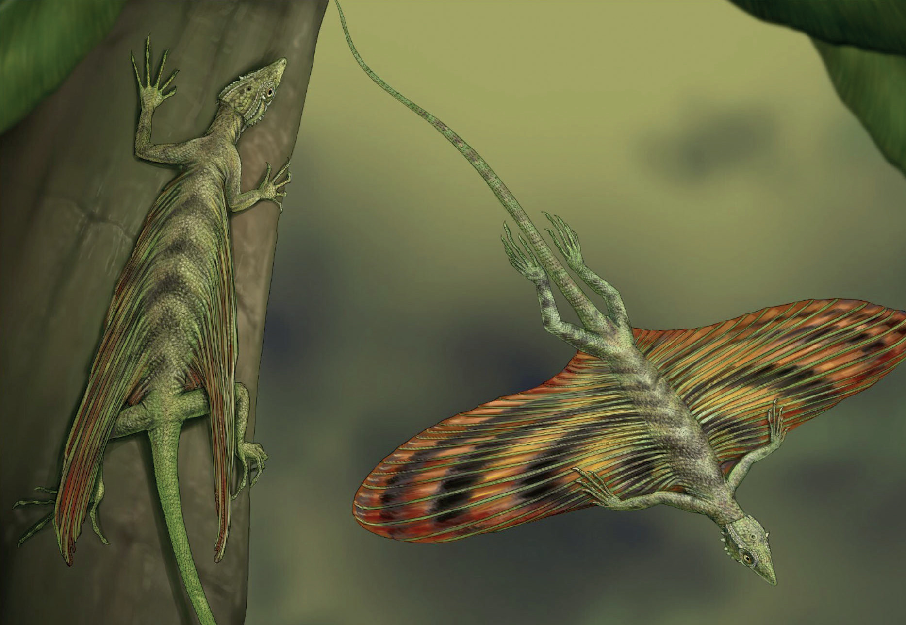 Как и в случае с возвращением в воду (см. наш цикл о Мезозойской морской революции), воздух первыми начали покорять рептилии, которые были загнаны на деревья синапсидами. Похожие на ящериц создания сначала пытались приспособиться к длинным прыжкам, а потом уже перешли к полноценному планированию. Для этого потребовалось всего… 50–60 млн лет с момента появления рептилий.