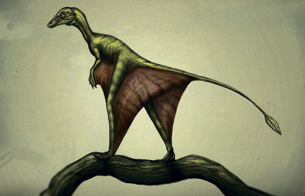 В процессе эволюции архозавроморфы тоже обратили свой взор к воздуху, причем происходило это несколько раз. Так, в позднем триасе в Вирджинии (~220 млн лет) жила рептилия мекистотрахелос (Mecistotrachelos apeoros Fraseretal., 2007), у которой мы встречаем знакомую структуру: удлиненные ребра, между которыми должна была проходить перепонка. Правда, эксперимент оказался неудачным, и никаких других подобных архозавроморфов мы не нашли. Куда более успешным был киргизский шаровиптерикс (Sharovipteryx mirabilis (Sharov, 1971)), обитавший примерно в то же время, что и мекистотрахелос. Он додумался сделать крылья, правда, ненормальные: перепонка у шаровиптерикса располагалась на задних конечностях, из-за чего он вряд ли был способен к активному полету, ограничиваясь лишь планированием. Эта конструкция оказалась более успешной, чем глайдермекистотрахелоса, поскольку известно целых два рода, пошедших по этому извращению с ногами: кроме шаровиптерикса, подобную структуру нашли у озимека (Ozimek volans Dzik&Sulej, 2016), жившего несколько раньше, 230 млн лет назад, на территории современной Польши. Озимек считается родственником киргизского «парашютиста», составляя обособленную летающую кладу внутри семейства танистрофеид (Tanystropheidae Gervais, 1858), которые были этакими «вездеходами» триаса. Среди них встречались и плавающие, и наземные формы, но о них стоит поговорить отдельно.