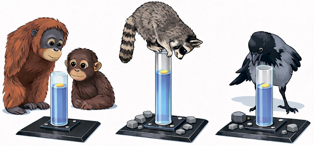 Удивительно, что в начале этот эксперимент адаптировали для орангутанов. В исследовании, проведенном на пяти орангутанах в возрасте 7, 11, 16, 17 и 32 лет, в прозрачный цилиндр, заполненный водой на ¼, помещали арахис. Все пять орангутанов добыли приманку из цилиндра в первой же пробе: они набирали воду из поилки в рот и добавляли ее в цилиндр, и повторяли это действие столько раз, пока приманка не становилась доступной. Кроме приматов, способность к решению Эзопова теста среди млекопитающих исследовали только у енотов. В целом полученные результаты показали, что енотов можно научить помещать камни в цилиндр для добывания приманки. Однако они обучались решению задач, требующим выбора между двумя типами цилиндров или объектов, медленнее или так и не обучались, в отличие от грачей или новокаледонских ворон, которые и здесь буквально наступают на пятки приматам.