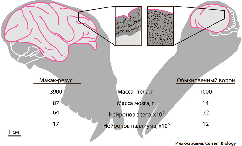 Действительно, у птиц нет привычной нам шестислойной коры больших полушарий, а масса мозга, на первый, взгляд невелика. Лишь в XXI веке научным сообществом было признано, что у птиц есть структура, которая выполняет функции коры млекопитающих. Хотя устроена она не слоями, а ядрами нейронов, и эта «альтернативная кора» обеспечивает высокий уровень обработки информации. Более того, по числу нейронов в переднем мозге некоторые пернатые могут в очередной раз посоперничать с приматами: у певчих птиц и попугаев невероятно высокая плотность нейронов в паллиуме – вдвое больше, чем у приматов с тем же размером мозга.