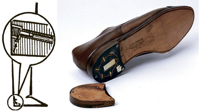 Слева: стреляющее устройство в каблуке ботинка. Справа: для производства выстрела достаточно ударить каблуком о преграду