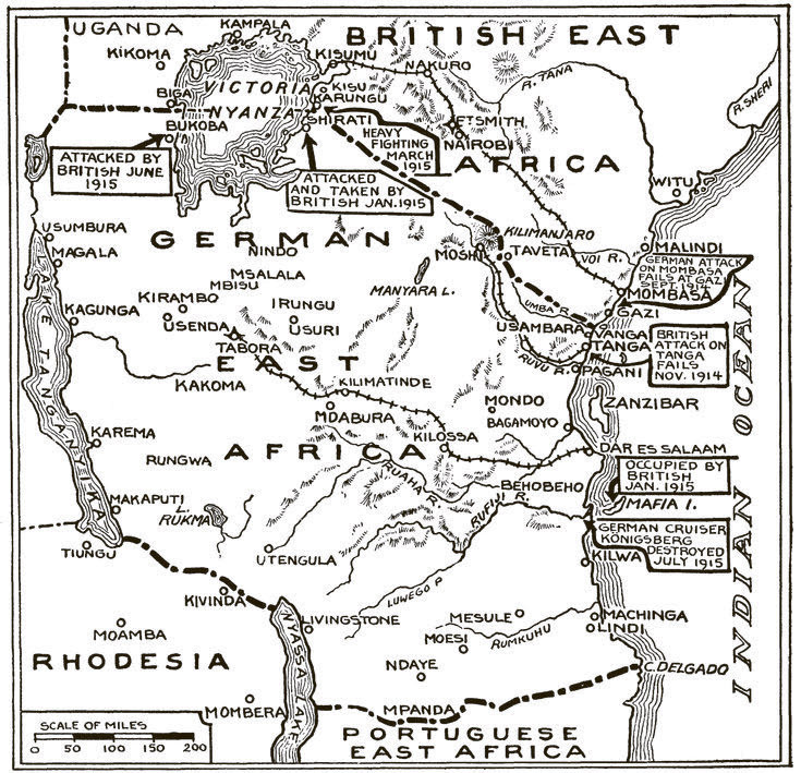 С началом Первой мировой все азиатские и африканские колонии Германии оказались в полной изоляции от метрополии, в глубине огромных британской и французской колониальных империй. Никаких шансов получать подкрепление и снабжение у немцев не было, поэтому колонии были изначально обречены. Тем не менее их захват не был «легкой прогулкой», особенно в Восточной Африке. Это была огромная территория, в три раза превышавшая площадь метрополии и входящая в настоящее время в состав Танзании, Руанды и Бурунди. Даже боевые операции действовавший там колониальный корпус завершил спустя несколько дней после подписания 11 ноября 1918 года перемирия в Европе. Немецкая Восточная Африка была самой густонаселенной колонией Германской империи, в ней проживало около 7,75 млн жителей, в том числе более 5 тыс. европейцев (из которых более 4 тыс. – немцы). К началу войны немцы имели там около 2,8 тыс. военнослужащих (2540 африканцев и 216 немцев), и 2,2 тыс. полицейских (45 немцев и 2154 африканца), в подавляющем большинстве – аборигенов-аскари, происходящих от смешения арабских колонистов с местными племенами. Командовал немецким контингентом полковник Пауль Эмиль фон Леттов-Форбек (Paul Emil von Lettow-Vorbeck; 1870–1964). Ему удалось создать хорошо обученные профессиональные подразделения из числа местных жителей («askari»), бойцы которых с огромным уважением и преданностью относились к своему командиру, вобравшему в себя лучшие черты настоящего прусского офицера.
