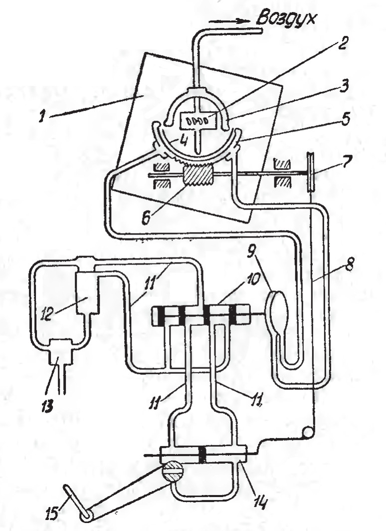 В таком автопилоте два гироскопа – гирополукомпас (ГПК) и авиагоризонт. Они раскручиваются потоком воздуха, идущего в вакуумную систему. С рамой гироскопа связана вакуумная заслонка, перекрывающая при отклонении гироскопа от нейтрали один из двух каналов приемного коллектора. Эти каналы идут к камере пневмореле, которое управляет гидравлическим золотником, подающим гидросмесь в исполнительный цилиндр (рулевую машинку – РМ), от которого уже перемещаются рули. Давление в гидросистеме невелико – порядка 10 кгс/см². От рулевой машинки идет цепь обратной связи к приемному коллектору гироскопа, за счет этого автопилот работает плавно: если расхождение между фактическим, например, креном и заданным велико, то, как рулевая машинка ни сдвигай коллектор, все равно один канал будет перекрыт, потому что гироскоп завален от нейтрали сильно.