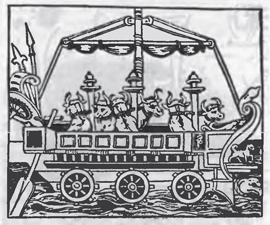 Однако первые упоминания о гребном колесе, для привода которого использовалась мускульная сила человека или животных, относятся еще к древнейшим временам. На римском барельефе, датируемом VI веком до н. э., изображено судно с тремя парами гребных колес, которые приводятся в движение волами.