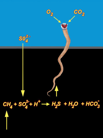 Сульфатредуцирующие бактерии, обитающие в толще осадка, используют сульфаты для анаэробного (то есть протекающего в отсутствие свободного кислорода) окисления метана. Продукт этой реакции — сероводород, который проникает в организм сибоглинид. Мы помним, что трубки погонофор открыты на заднем конце, а у вестиментифер, обитающих в районах холодных просачиваний, погружённые в осадок участки трубок имеют тонкие пористые стенки, проницаемые для сероводорода.