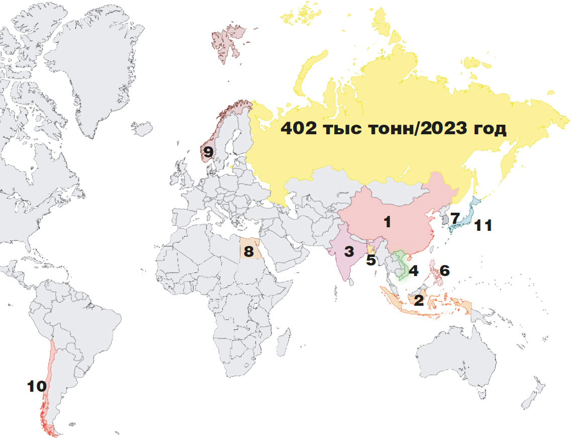 Россия не входит в число лидеров по производству аквакультурной продукции, причина тому — развитое морское рыболовство, способное удовлетворить потребности населения в дикой рыбе. Кроме того, рост индустриальной аквакультуры в стране существенно сдерживает проблема разработки и производства искусственных кормов (научные разработки ведут, но в небольшом объёме). Хотя в последнее время интерес к этой продукции растёт, и в 2023 году её производство в России выросло на 4,8% по сравнению с предшествующим годом, достигнув 402 тыс. т. Основные виды, выращиваемые в нашей стране искусственно, — рыбы (лососёвые, карповые, осетровые), а также другие ценные жители моря — устрицы, мидии, гребешки и иные моллюски, иглокожие.