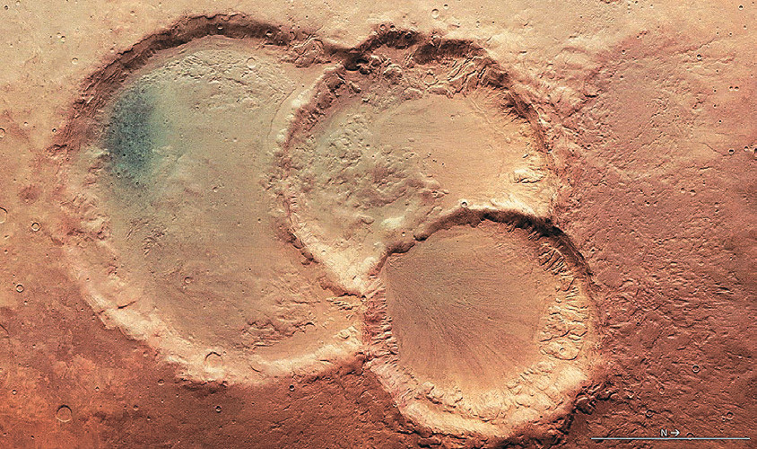 Необычную тройку кратеров сфотографировал в южном полушарии Марса европейский космический аппарат «Марс-Экспресс». Кратеры диаметрами от 28 до 45 км частично перекрываются. Астрономы предполагают, что метеорит, упавший на планету около 4 миллиардов лет назад (именно таков возраст горного плато, над которым сделан снимок), раскололся натрое при пролёте через довольно плотную атмосферу, тогда окружавшую Марс.