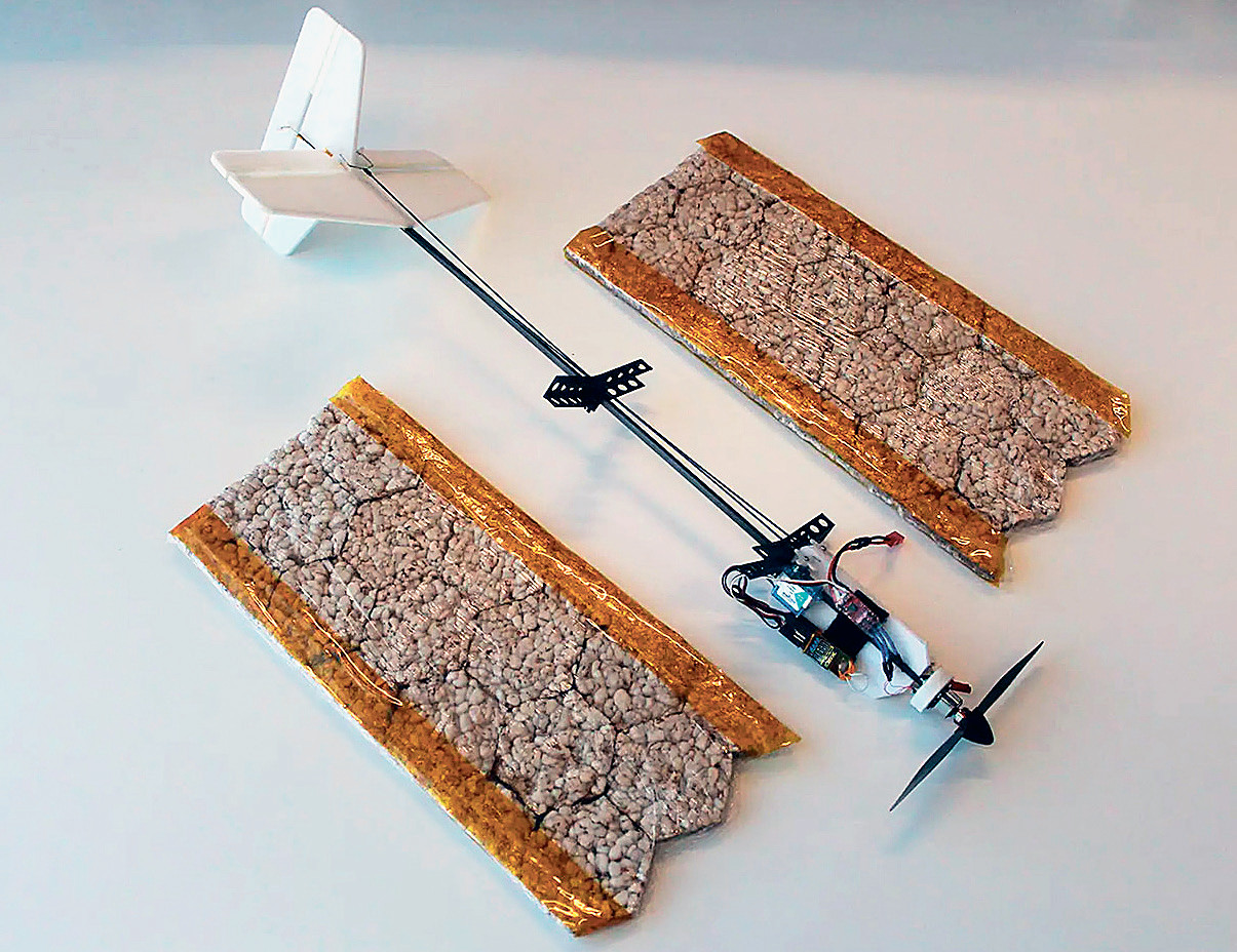 Инженеры из Федеральной политехнической школы Лозанны (Швейцария) изготовили дрон, способный прилететь на помощь человеку, заблудившемуся в горах, и накормить его. Крылья небольшого летательного аппарата сделаны из расплющенных и прессованных рисовых хлопьев, склеенных желатином. По прочности материал сравним с обычно применяемым в дронах пенопластом и не менее лёгок. Скорость полёта порядка 10 м/с. Ожидая помощи, пострадавший может съесть крылья. При размахе крыльев 70 см они дадут голодному 300 килокалорий, что равноценно обычному завтраку. Несъедобные детали — аккумулятор, электромотор, пропеллер, радиомаячок и хвостовое оперение (но последнее в дальнейшем собираются также делать из риса).