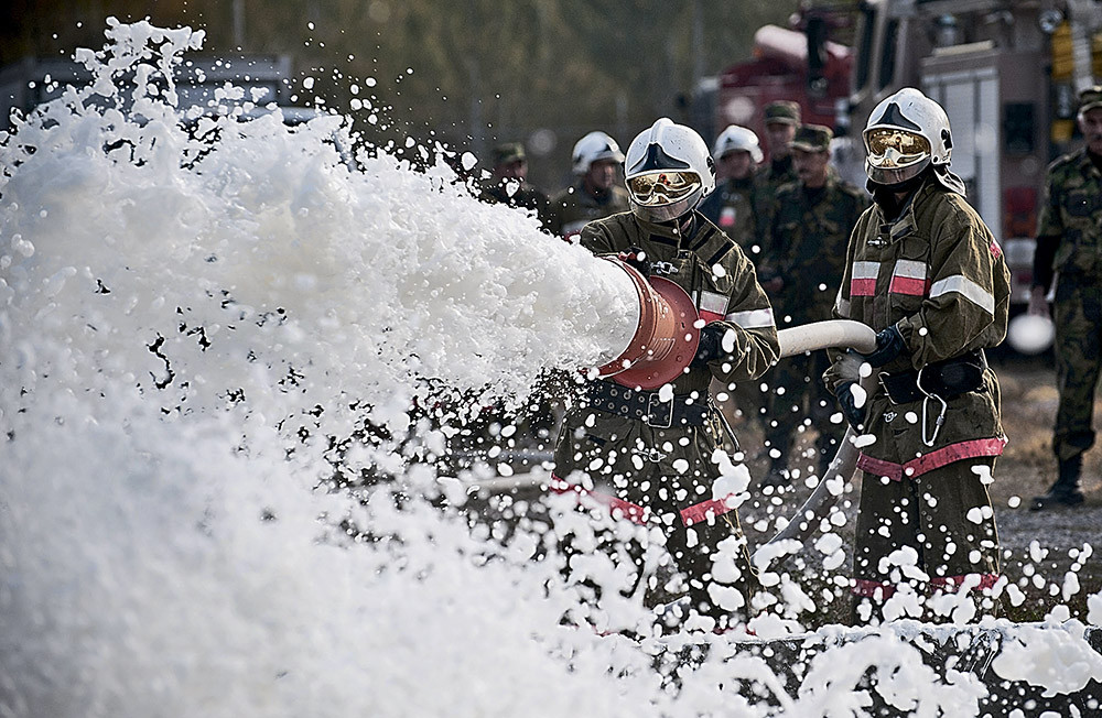 Пожарные во время учений используют пеногенератор.