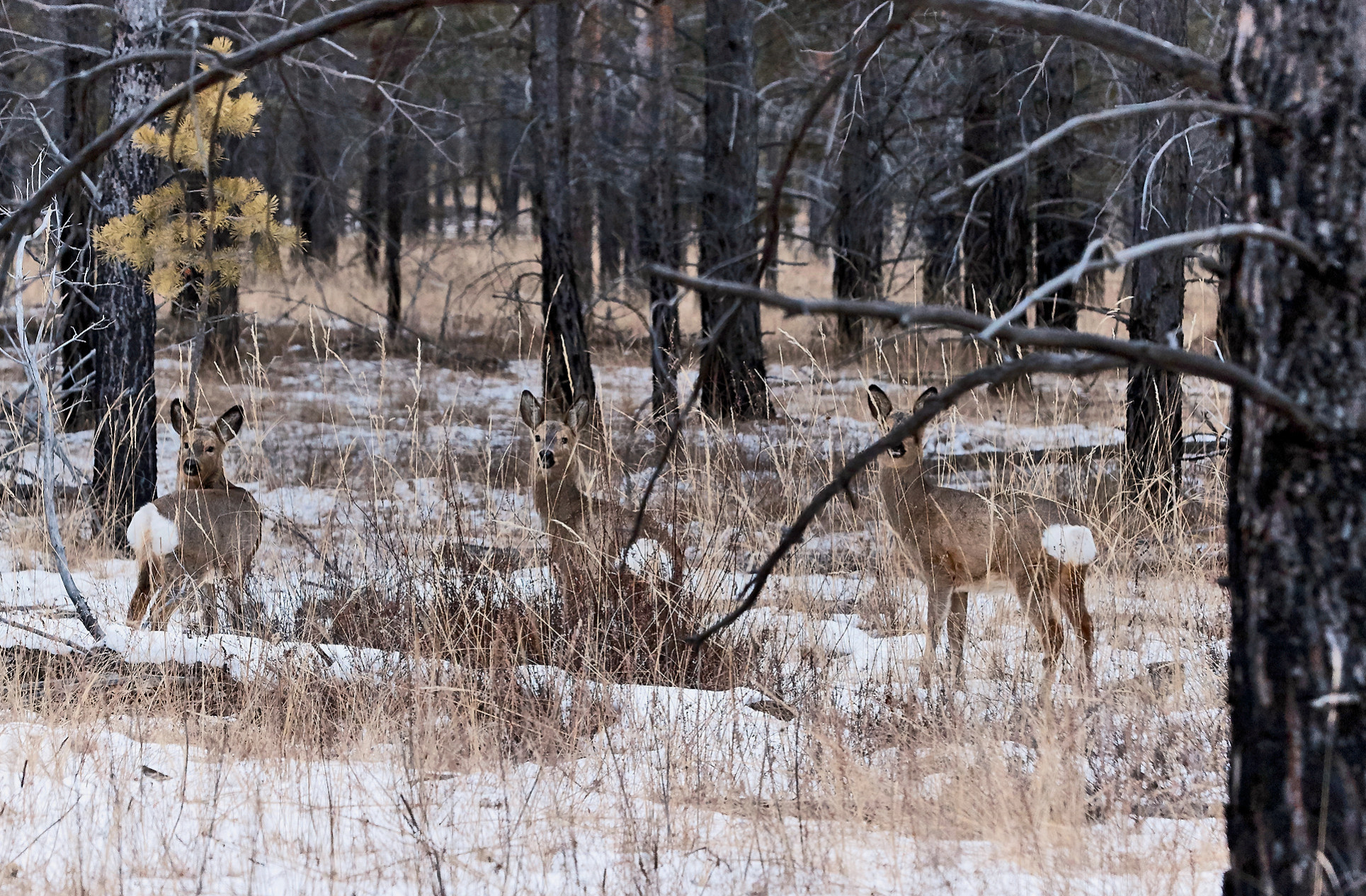 В полной мере испытав гостеприимство сотрудников в конторе заповедника, на пути к первому кордону пересаживаюсь в более проходимый транспорт, ведь наш путь лежит по заснеженной степи без предполагаемых остановок. Но какое там! Только мы въехали в сосновый лес, называемый Цасучейским бором, как на дорогу неожиданно выскочили косули, да много! Среди серо-золотистых стволов местных сосен (сосна Крылова) косули практически не заметны. Единственное, что их выдаёт, — белые пятна на задней части туловища. Тут и статные рогали-самцы, и мелкие самочки, оберегающие своих подростков-сеголеток, — все они тревожно вглядываются в «страшные» слепящие фары нашего автомобиля. Как и любые олени, сибирские косули очень пугливы, и едва завидев человека, они уже скачут опрометью прочь, подкидывая вверх свои белоснежные «сидушки».
