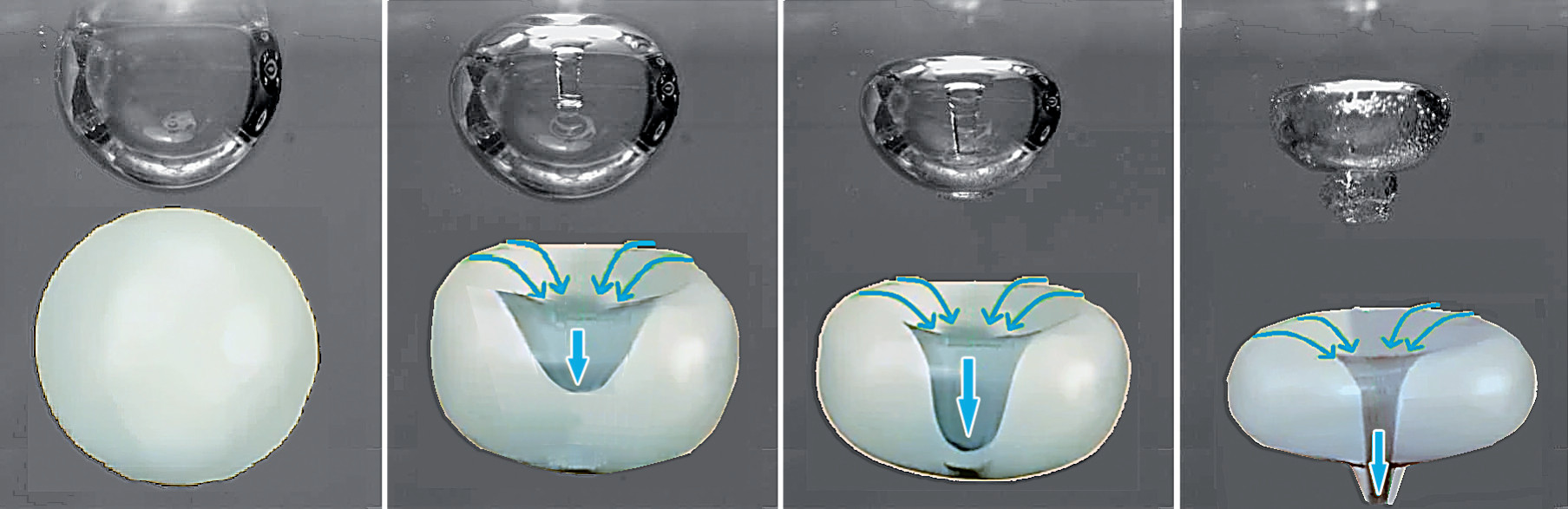 Открытое в конце XIX века явление кавитации заключалось в образовании и росте паровых пузырей в воде, когда из-за движения давление в некоторой её области становилось ниже давления насыщенного пара. Насыщенный пар в спокойном состоянии находится в равновесии с жидкостью. Можно сказать, что при этом давление воды не даёт расти всегда существующим в ней затравочным газовым и паровым пузырькам. Но когда равновесие нарушается, пар сразу их раздувает. А затем, при переходе в область с большим давлением воды, пар в пузырьках конденсируется в воду и его объём очень сильно уменьшается. В результате давление воды приводит к схлопыванию или коллапсу пузырька. А поскольку это происходит быстро, возникает сильная ударная волна, способная разрушить даже металл. Собственно, кавитацию и обнаружили по разрушающему воздействию на быстро вращающиеся гребные винты паровых кораблей**.