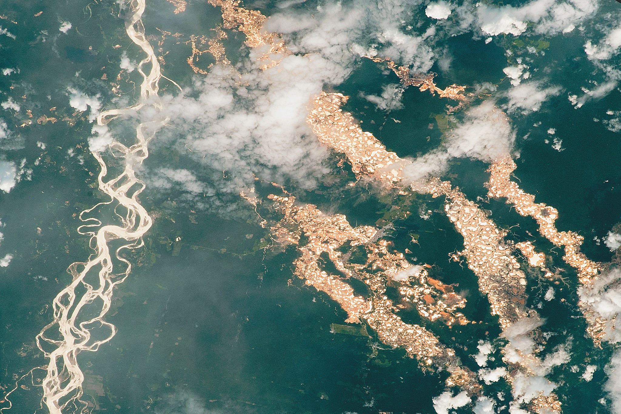 На снимке, сделанном NASA с Международной космической станции, с высоты около 400 км, показаны нелегальные разработки золота на востоке Перу. Кадр редкий, так как этот район обычно либо скрыт облаками, либо чётко сфотографировать его мешают слепящие объектив отблески солнечного света от поверхности близлежащего Тихого океана. Отдельные облака, не заслоняющие общей картины, видны и здесь.