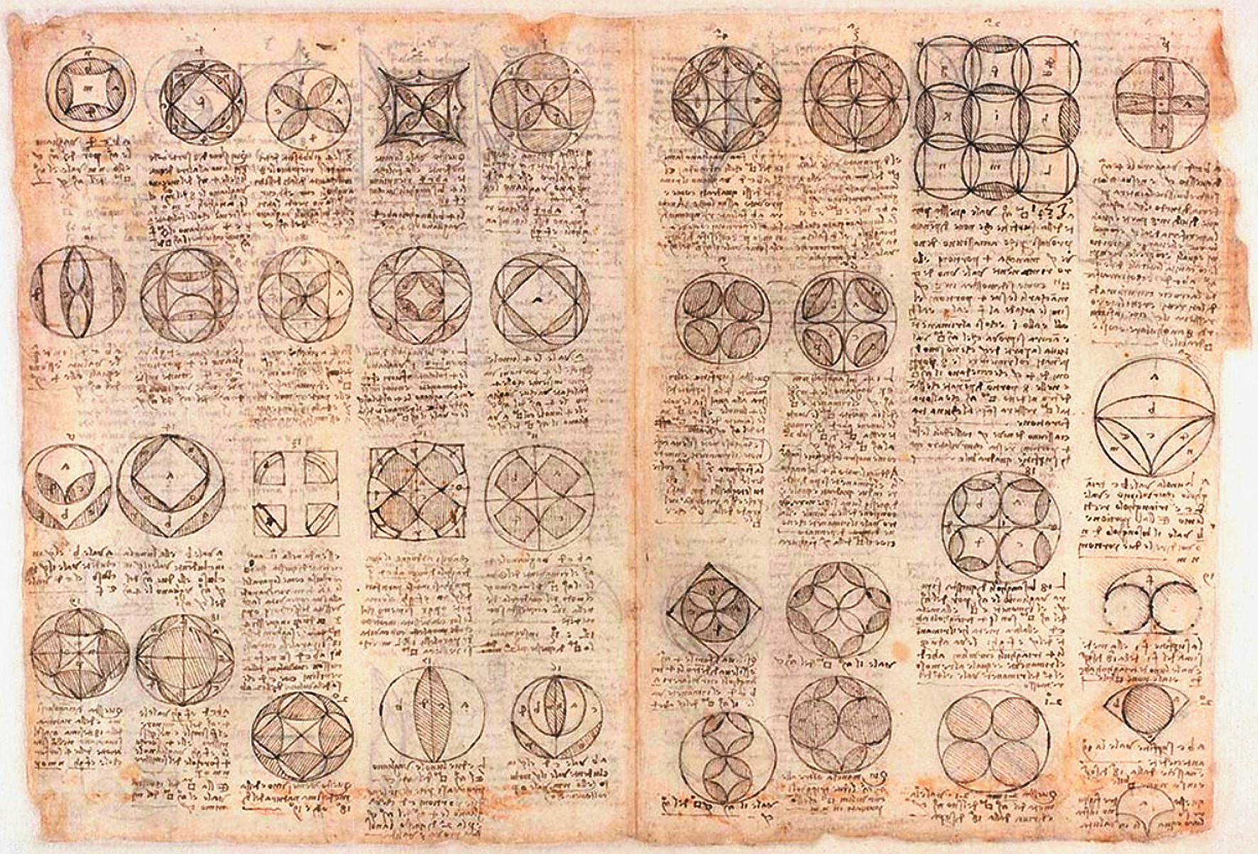 Как геометр и как художник Леонардо да Винчи с увлечением изучал плоские фигуры, ограниченные дугами окружностей. Страницы его записных книжек пестрят чертежами, где изображены луночки, «лепестки», сегменты и прочие криволинейные фигуры вкупе с кругами и многоугольниками, их образующими. Одни рисунки выполнены от руки, другие с помощью инструментов. Некоторые из них напоминают цветочные узоры и используются как элементы орнамента. Годами Леонардо пытался преобразовать одни фигуры в другие и придумывал новые, всё более сложные их комбинации, этакие импровизации на тему пленившей его задачи. Даже собирался написать книгу «О геометрической игре», посвящённую приёмам, которые, как он считал, обеспечат бесконечное разнообразие квадратур криволинейных фигур. Иными словами, для каждой из них можно будет построить многоугольник такой же площади. Леонардо да Винчи — один из первых европейских учёных, кто заинтересовался этой проблемой.
