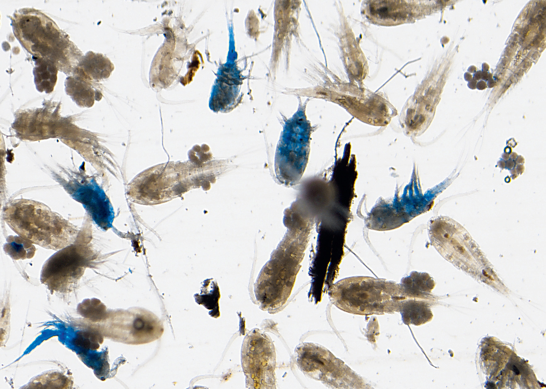 В основном я использую анилиновый голубой краситель. Он окрашивает организмы зоопланктона, умершие от часа — полутора часов до нескольких суток назад. Дело в том, что обычно мы не знаем, какие из организмов были живыми, а какие уже умершими в тот момент, когда мы отбирали пробу. Фиксируя пробы формалином, мы можем потом обрабатывать их в течение многих лет. В той же Кунсткамере в Санкт-Петербурге экспонаты, как мы знаем, хранятся столетиями. А я перед тем, как их зафиксировать, окрашиваю, и тогда мёртвые организмы становятся ярко-синего цвета, а живые остаются своего природного. Происходит это потому, что как только клетка погибает, её мембрана нарушается и становится проницаемой для данного красителя.