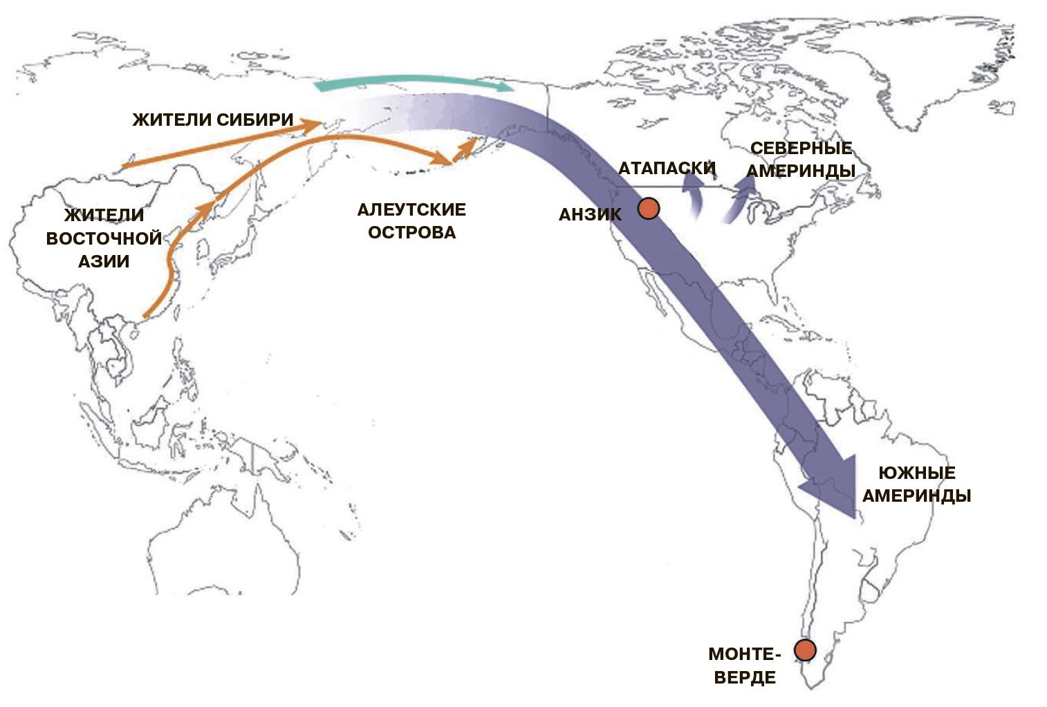 Берингийский перешеек — мост, связывавший два континента, — существовал в период от 27 до 11—10 тыс. лет назад, и, таким образом, перейти по нему люди могли только в этом интервале времени. Что касается нижней границы, то с помощью палеоклиматической и палеоботанической реконструкции учёные вычислили, что это не могло случиться раньше, чем 23 тыс. лет назад (то есть после пика оледенения, произошедшего 26 тыс. лет назад). О верхней границе можно судить по археологическим находкам на территории Америки. Долгое время самыми древними считались артефакты культуры Кловис* — характерные кремневые наконечники возрастом от 13,5 тыс. лет. Генетики прочитали геном палеоиндейца культуры Кловис, использовав образец Анзик-1 возрастом 12 600 лет. Но затем в разных частях Северной Америки нашли более древние археологические памятники возрастом не менее 14 тыс. лет, а древнейшие достоверные следы обитания человека на Аляске (нижний культурный слой стоянки Свон Пойнт — Swan Point Archeological Site — археологический объект в восточной части центральной Аляски, на реке Танана) датируются временем 14,8—14,7 тыс. лет назад. Ещё более удивительно, что артефакты, датируемые 14 тыс. лет назад (каменные орудия и останки плейстоценовых животных), были найдены в Южной Америке — на территории современных Аргентины и Чили. Как получилось, что люди так быстро добрались до Южной Америки, остаётся загадкой.