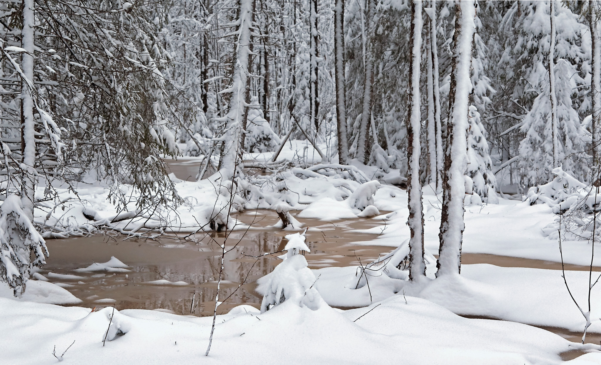 Пробираясь дальше по еле заметным звериным тропам, я понимаю, что они куда-то обязательно выведут. Так обыкновенно и происходит. Чаще всего эти маршрутные ниточки заканчиваются водопоем. Многочисленные лесные озерца и лужи сейчас ещё подо льдом, только оттепели вскрывают их травянистые края, а вот роднички, дающие начало небольшим речкам, питают наших лесных соседей свежей водичкой.