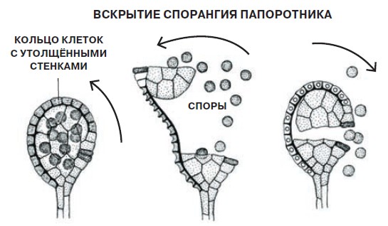 Спорангий представляет собой шаровидный мешочек, имеющий по экватору кольцо клеток с утолщёнными стенками, которые необходимы для рассеивания спор. По мере созревания спор стенки спорангия высыхают и растрескиваются. Кольцо резко разворачивается, а затем быстро сворачивается, занимая прежнее положение. При этом споры разлетаются на расстояние до одного метра. Механизм срабатывания кольца напоминает механизм катапульты — метательной машины, приводимой в действие силами упругости скрученных волокон (сухожилий, ремней и т. п.).