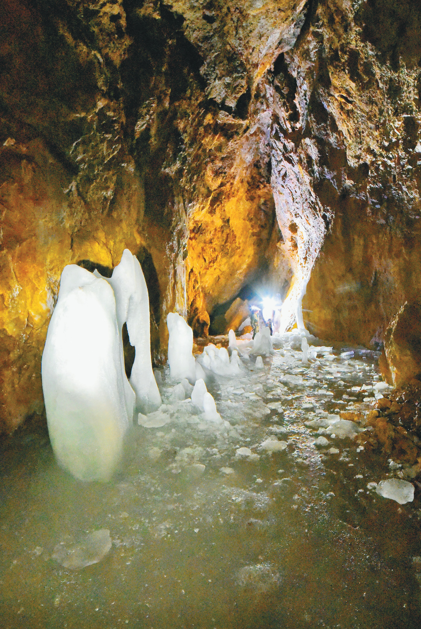 От этого зала ответвляется небольшой грот, лишь частично заплывший льдом. В нём поверх рыжеватых глыб вырос роскошный «сад» ледяных сталагмитов.