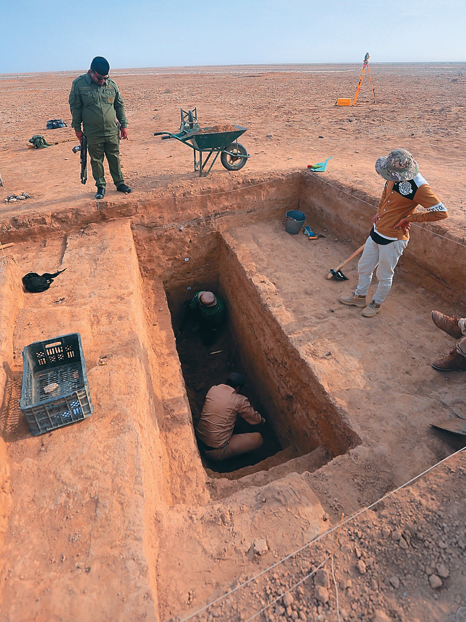 Археологи Акрам Мохсен и Фадл Джасеб работают на уровне материка в шурфе № 2. Слева — стена теменоса, хорошо виден выдающийся цоколь стены
