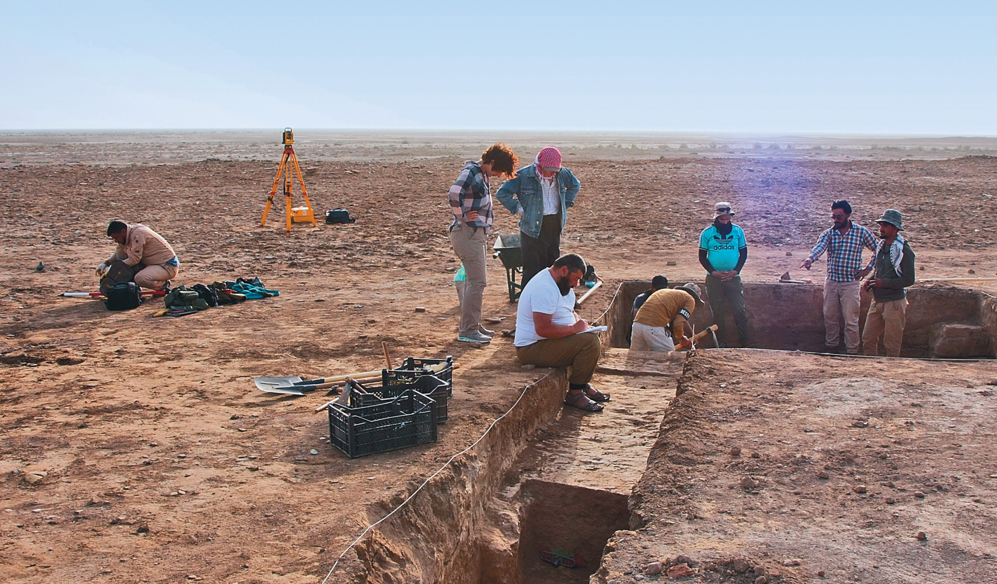 Российско-Иракская комплексная экспедиция, городище Телль Дехайла. Траншея № 1 и примыкающий к ней шурф № 2. Археолог Максим Меньшиков записывает информацию в полевой дневник, сидя на бровке раскопа. Под ногами у него — широкая стена теменоса