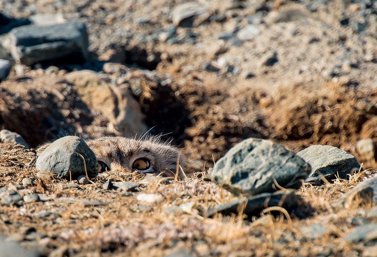 Фотографируя пейзаж, я вдруг почувствовала на себе чей-то пристальный взгляд. Это был тот неловкий момент, когда кажется, что за тобой кто-то следит. Настроила фокус на каменистую россыпь, за которой притаился «некто», и стала ждать. В какой-то момент моргнула, и именно в эту секунду за камнями что-то мелькнуло. Щелчок затвора вслепую — и наглая плоскоухая шерстяная морда исчезла в норе. Я просидела ещё около часа за камнями с подветренной стороны в ожидании манула, но этот желтоокий колобок так и не вышел. Манул всех обманул!