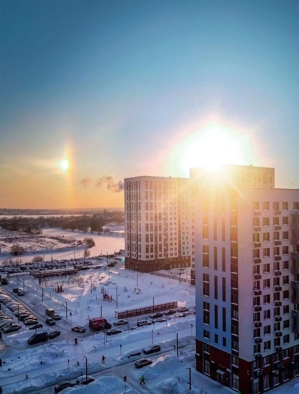 В ясные морозные зимние дни вокруг Солнца видно большое кольцо — гало (с ударением на последнюю букву), а иногда и два ярких пятна на нём — ложные солнца, или паргелии.