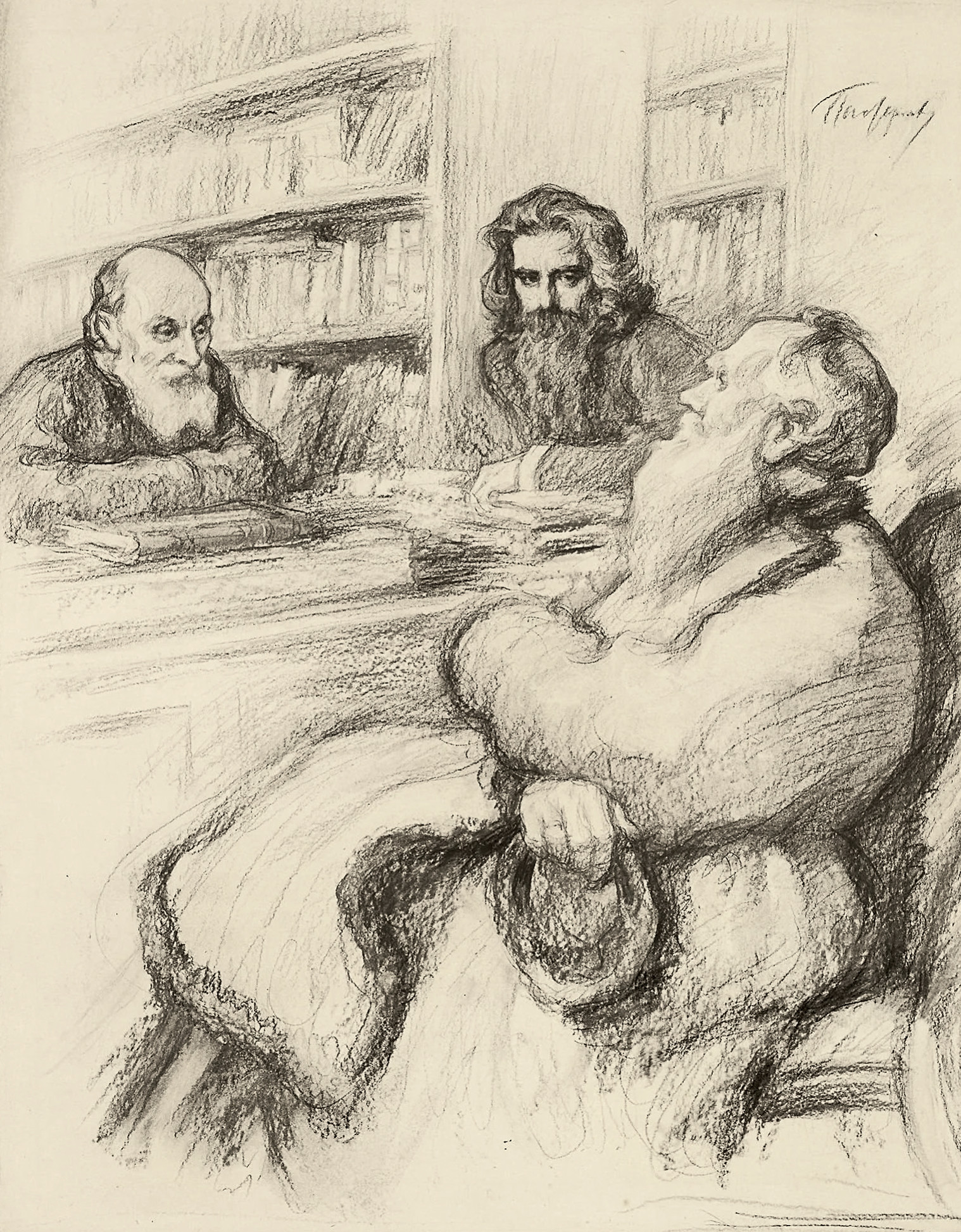 (1853—1900) и Лев Николаевич Толстой (1828—1910). Эскиз работы Леонида Пастернака. 1928 год. Из коллекции Музея Л. О. Пастернака в Оксфорде, Великобритания. Источник: rsl.ru