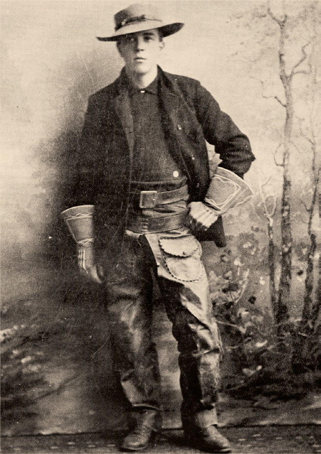 Американский фантаст Эдгар Райс Берроуз (1875—1950) в период работы ковбоем на семейном ранчо в Айдахо. Фотоснимок неустановленного авторства. 1891 год. Из коллекции компании Edgar Rice Burroughs, Inc. Источник: www.erbzine.com